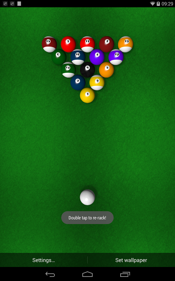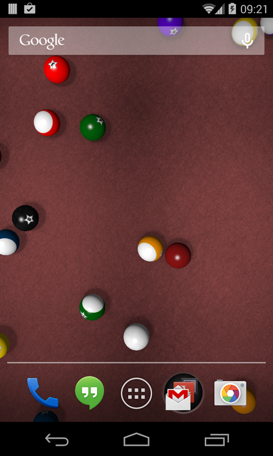 Полностью интерактивный бильярдный стол в качестве живых обоев на экране вашего Android устройства. С использованием OpenGL технологии шары будут реалистично катится и взаимодействовать с препятствиями, а так же отбрасывать тень и реагировать на освещение. Обои поддерживают как портретную, так и альбомную ориентацию.