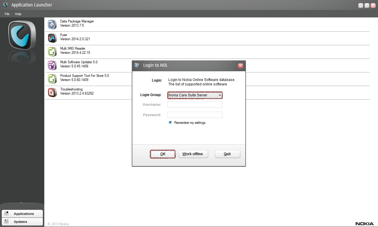 2. Если по какой-то причине аутентификация с Nokia Care Suite Server не проходит, нажмите "Work offline" и "OK"