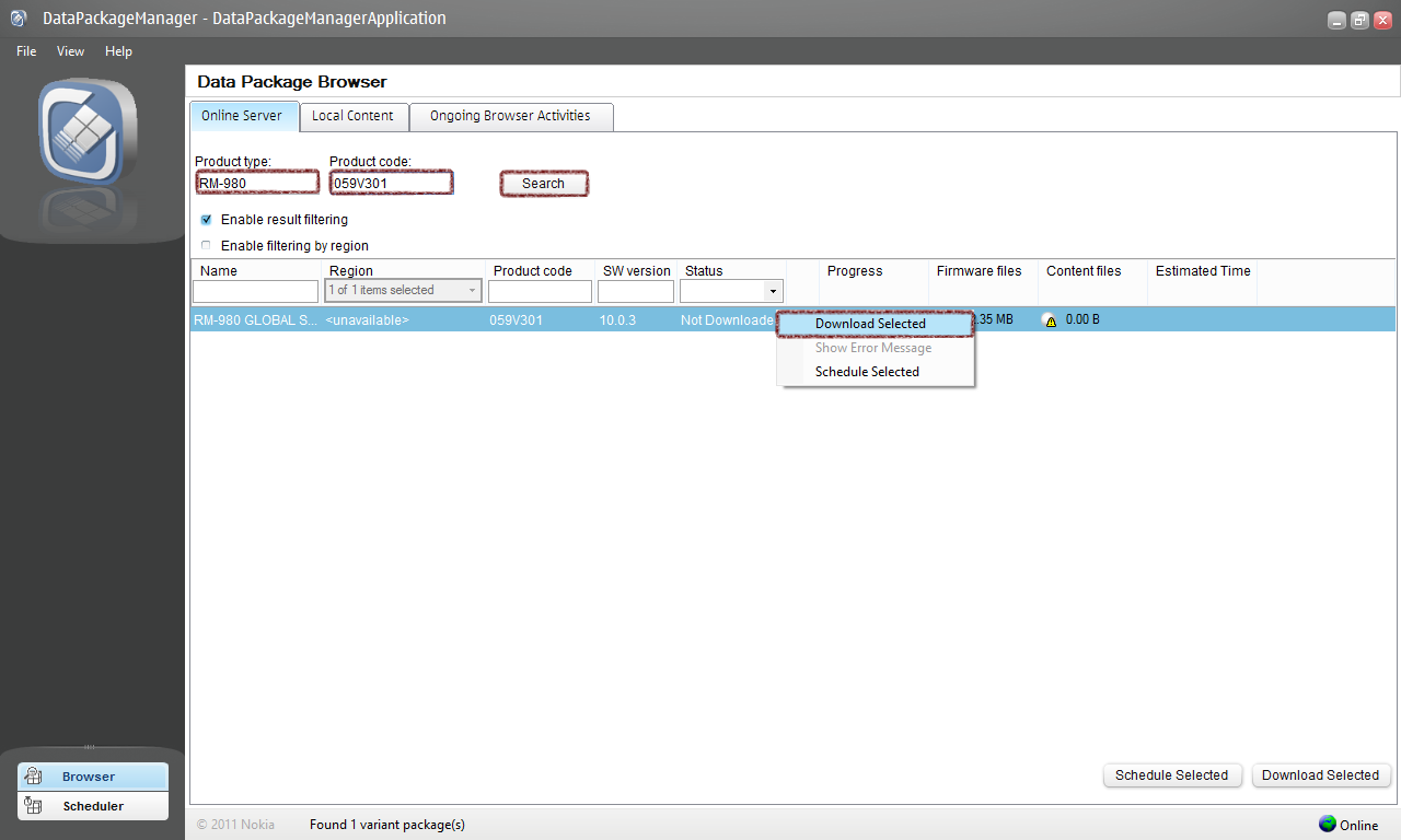 3. Далее заполняем поля Product Type и Product Code как показано на скриншоте ниже (для примера взята Nokia X RM-980). Как узнать свой Product type и Product Code смотрим в теме Номера прошивок Nokia X, Nokia XL, Nokia X+. После заполнения полей нажимаем "Search". После того как найдётся прошивка, сделайте по ней правый клик и выберите "Download Selected", далее дождитесь окончания загрузки.