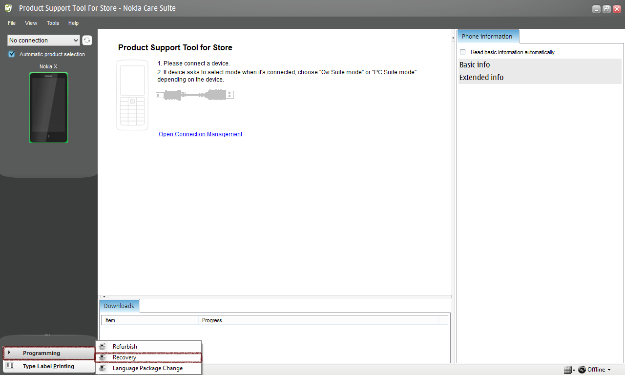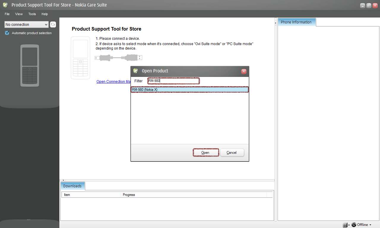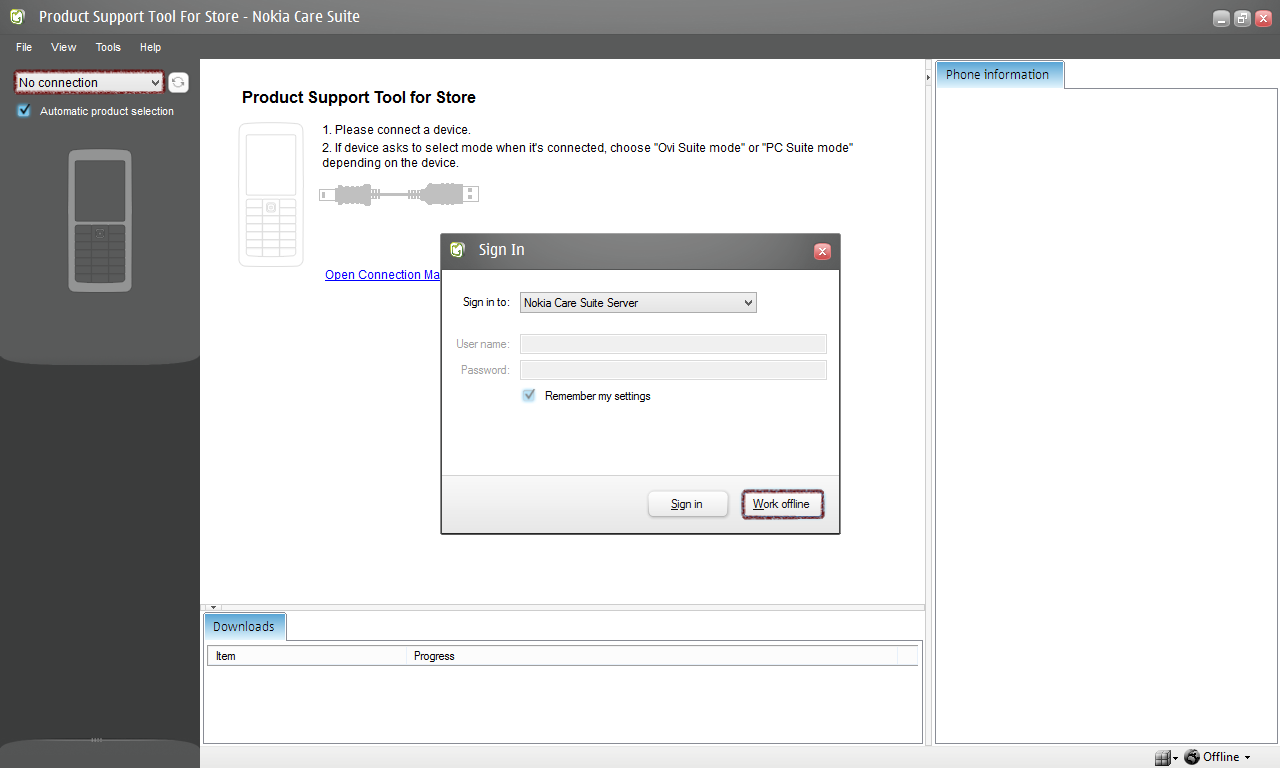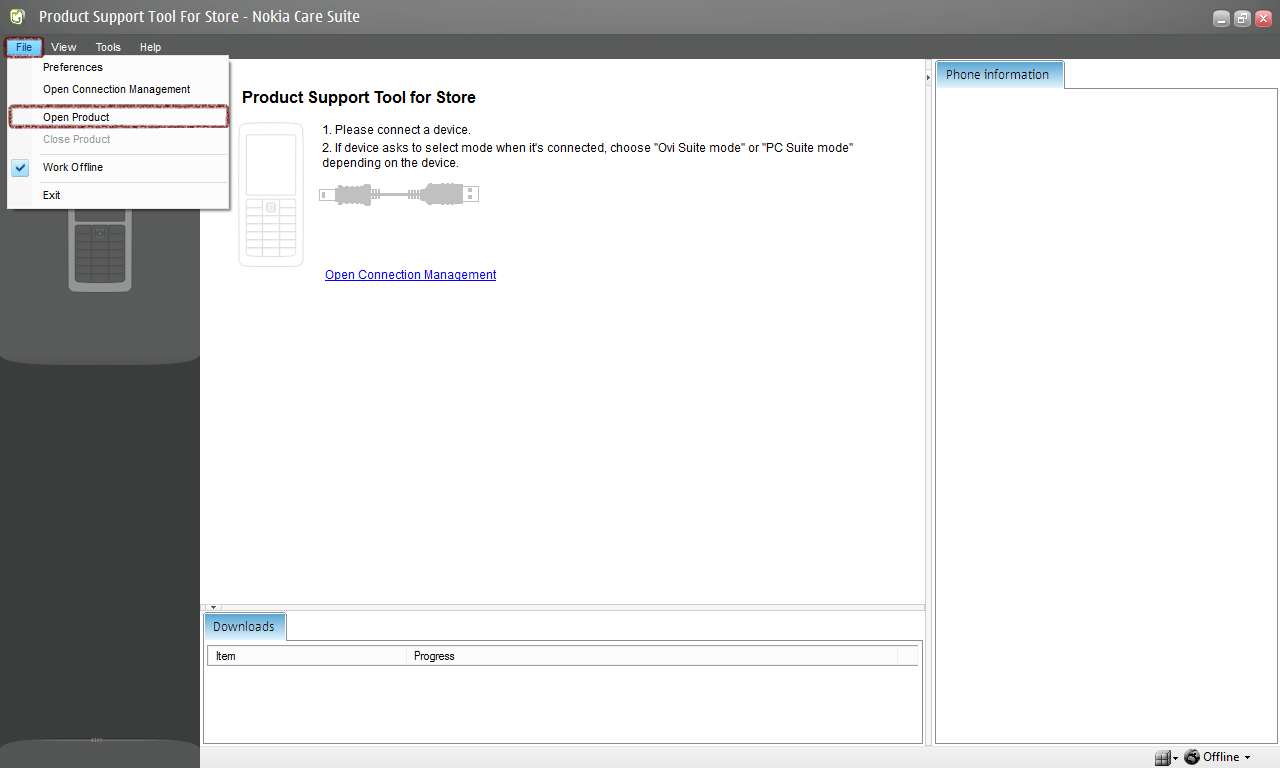 1. Запустите Nokia Care Suite и сделайте двойной клик по "Product Support Tool For Store 5.0". Нажмите "Work offline", оставайтесь в режиме "No connection"