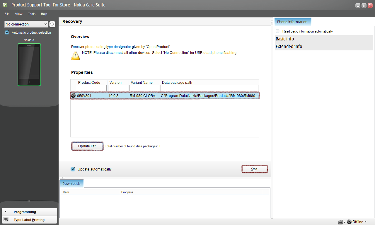 4. Далее нажмите "Update list". Выберите прошивку которую скачали. и нажмите Start, телефон не подключать пока что. Подождите немного пока "Product Support Tool For Store 5.0" проверит целостность пакетов и начнет прошивку. Далее вы получите сообщение об ошибке, это нормально, так как мы еще не подключили телефон.