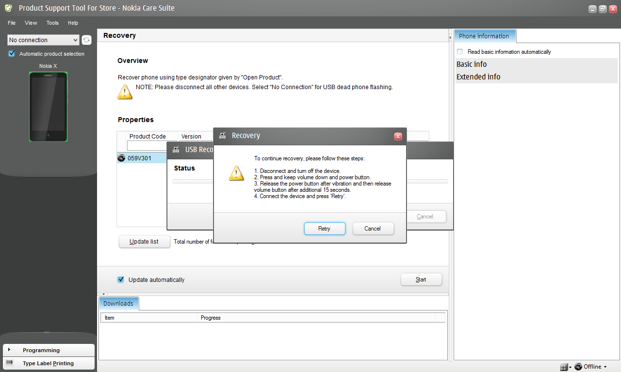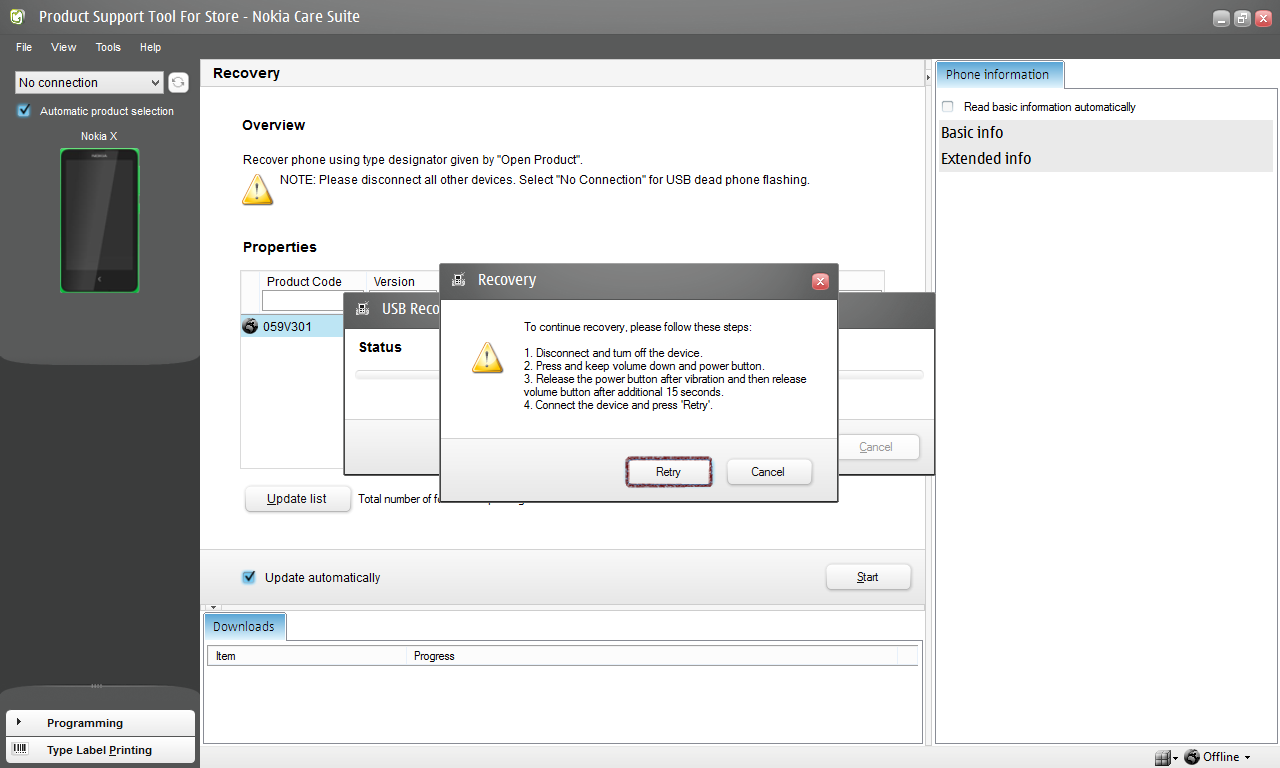 5. Далее возьмите USB кабель, от вашей Nokia на Андроиде, и воткните один конец в компьютер, телефон пока не подключать. Дальше возьмите телефон в руки и полностью его выключите. Далее нажмите и удерживайте кнопку звука вниз и кнопку питания. Как только телефон завибрирует отпустите кнопку питания, а кнопку звука вниз продолжайте удерживать еще 15 секунд. Теперь можно подключить телефон к USB кабелю, обратный конец которого уже находится в компьютере. Нажмите кнопку "Retry" в окне "Recovery".