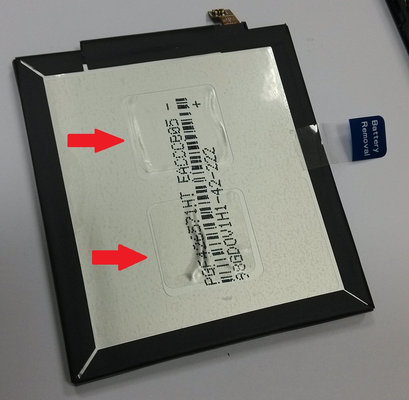 5. Снимаем с платы шлейф аккумулятора. Батарея приклеена и снимать ее нужно так: МЕДЛЕННО, но сильно тянем вверх за язычок "Battery Removal", при этом помогаем тем же куском пластика оторвать клей. Место клея указано.