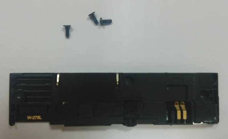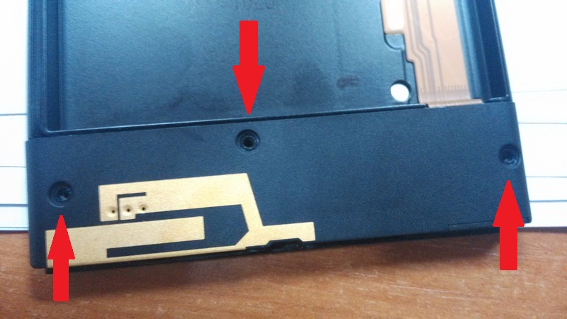 7. Отвинчиваем 3 винта на пластиковой крышке снизу. Снимается она без защелок, но с усилием. Отсоединяем от платы антенный разъем и снимаем антенный провод и резиновую заглушку провода. Саму плату аккуратно и постепенно отклеиваем слева направо. Дойдя до USB разъема, отклеиваем шлейф сверху. Сам USB разъем на металлической площадке. Внимательней, не пытайтесь отклеить шлейф от этой площадки.