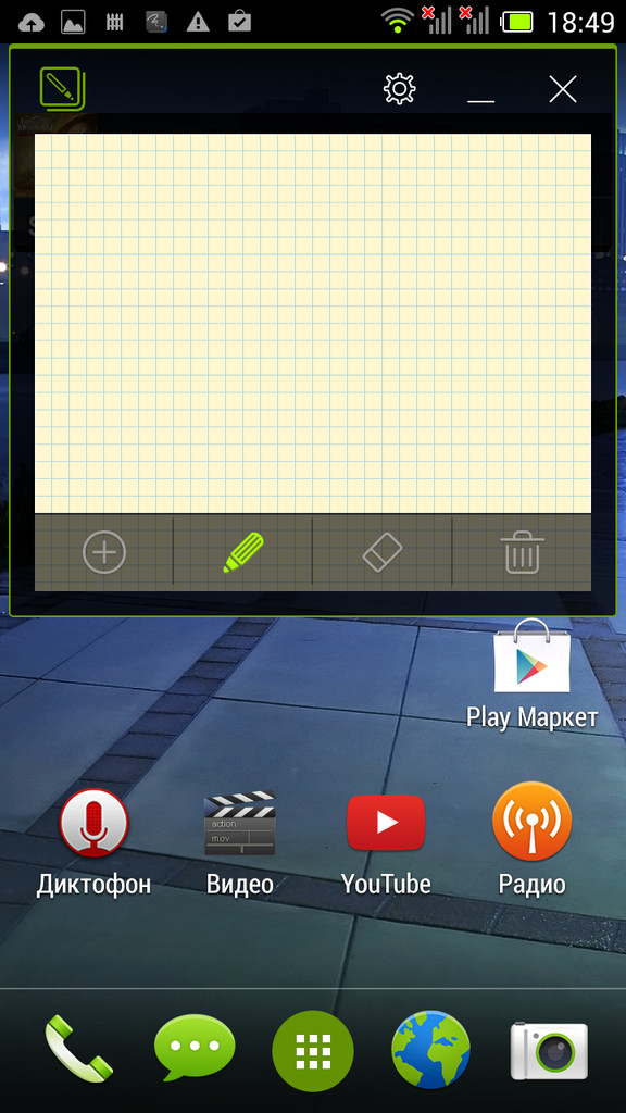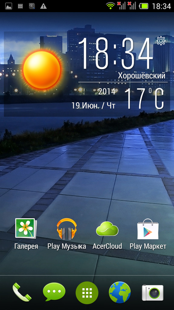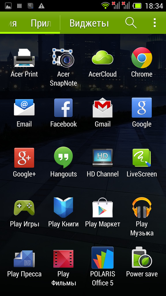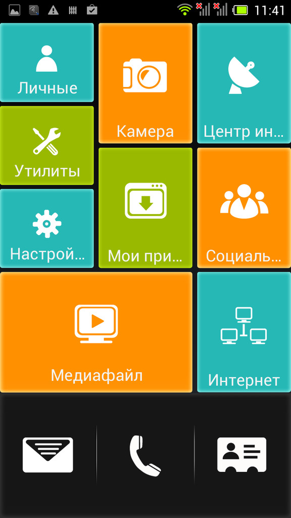 Главное меню типично для Android, это горизонтально прокручиваемая сетка иконок и виджетов. В стандартном лончере, к сожалению, нельзя группировать иконки в папки, (хотя это можно делать на рабочем столе).