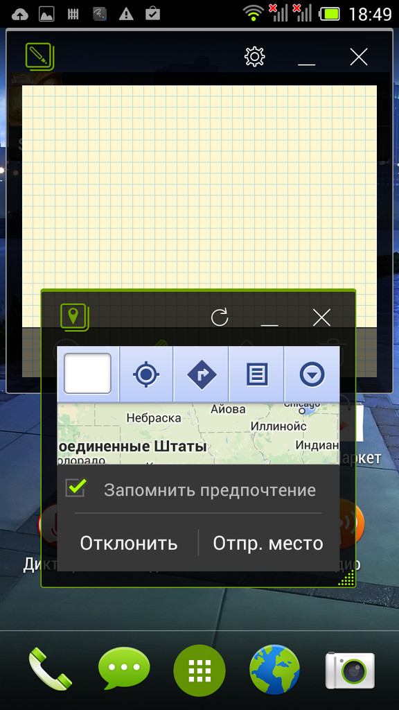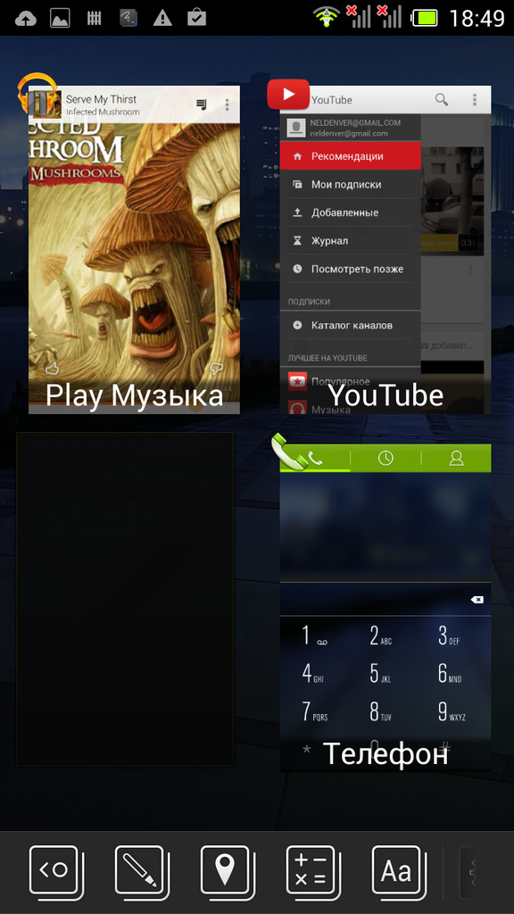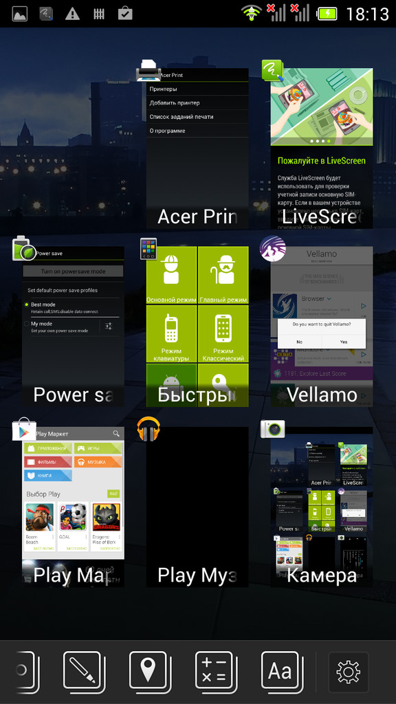 Фирменный интерфейс называется AcerFloat, в нем предусмотрены функции быстрого доступа в виде полупрозрачных панелей. Вызывается он удержанием кнопки диспетчера открытых приложений. Например, таким образом запускаются камера, карты, калькулятор, заметки или звонки. Последние могут выводиться в виде небольшого меню и не закрывать текущее приложение.