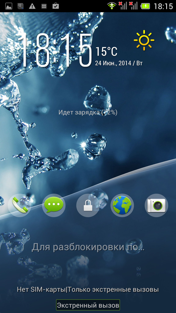 В заблокированном состоянии на экране в режиме ожидания отображаются четыре иконки быстрого запуска (их список можно настроить на свой вкус). Соответственно, эти приложения можно запустить и с экрана блокировки, достаточно сдвинуть их. Также на экране блокировки присутствуют часы, оповещения о различных событиях (звонки, SMS, электронная почта, если настроены). Красивая анимация в виде уровня воды также разнообразит экран блокировки.
