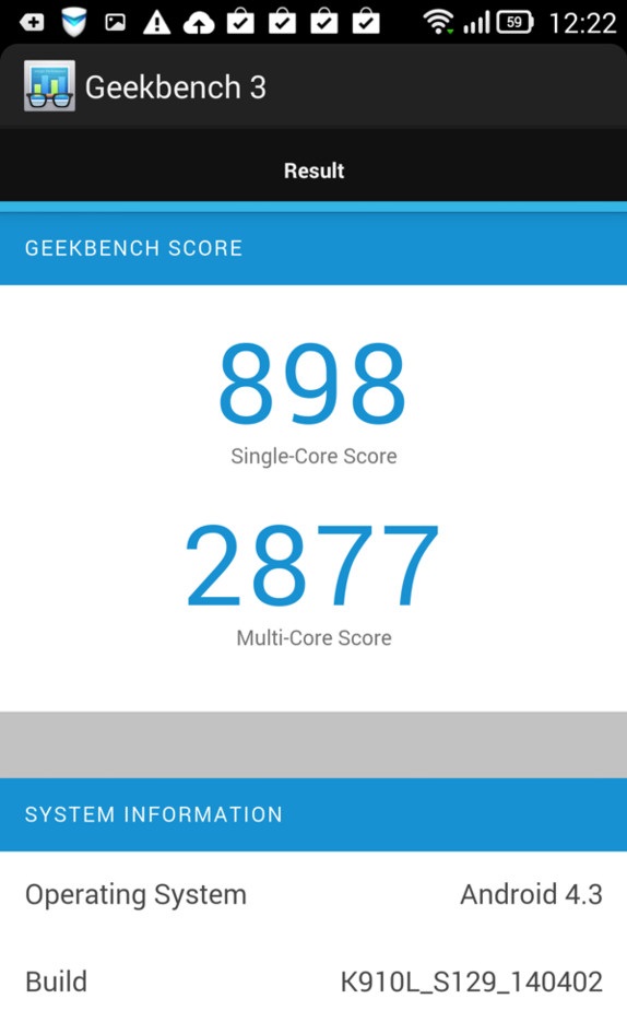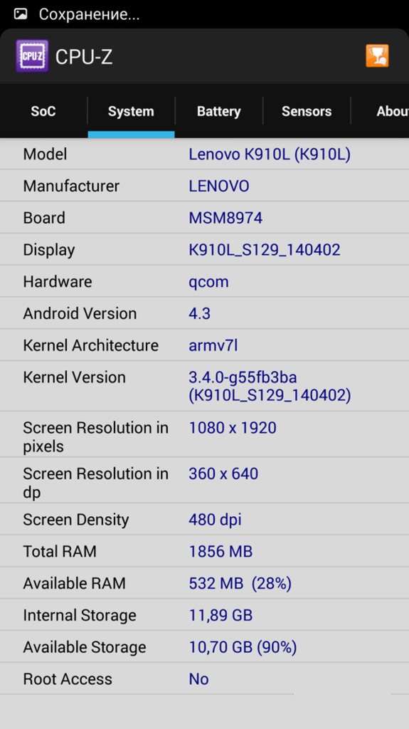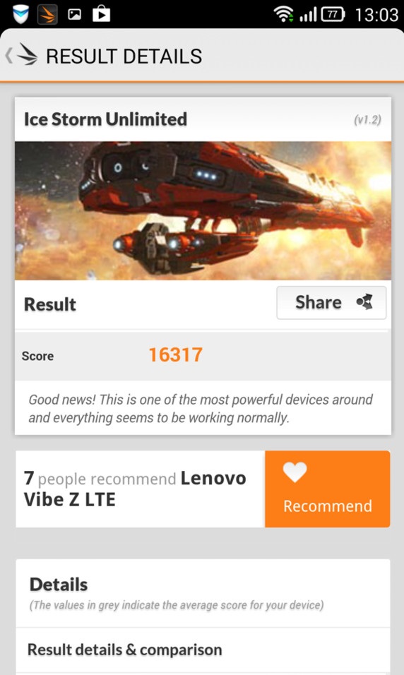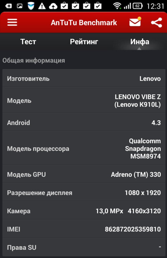 В новой модели Lenovo отказалась от использования чипа Intel, отдав предпочтение процессору от Qualcomm. По начинке Vibe Z похож на свои аналоги такого же класса, у него Snapdragon 800 с частотой 2,2 ГГц, графика Adreno 330. Смартфон работает быстро, результаты по производительности можно увидеть ниже на скриншотах. На смартфоне удобно играть в любые современные шутеры или гонки. Интерфейс работает быстро и плавно, чего и следовало бы ожидать от модели с такой начинкой.
