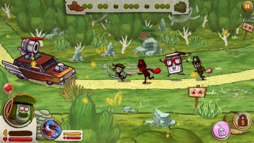 Кроме Мардэкая и Ригби в игре вы еще встретите Масл Мэна и Скипса, но они разблокируются немного позже, когда вы пройдете несколько уровней. Каждый из героев обладает своими характеристиками, например Мордэкай поражает врага на большом расстоянии, а Ригби наносит сокрушительные удары и более эффективен против башен.
