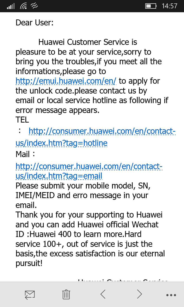1. Отправляем письмо на mobile@huawei.com со следующими данными:
