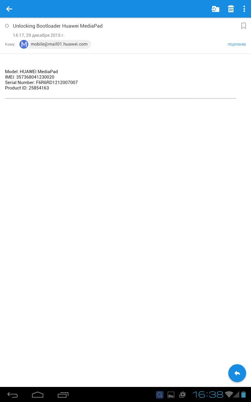2. Ждем письма от huawei@mobile.com. Может прийти сразу, а может через несколько дней или вообще неделю.