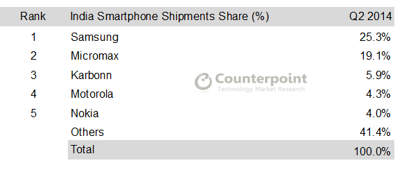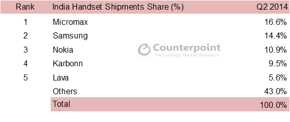 Плохие новости для доминирующих на мировом рынке смартфонов Samsung поступают со всех фронтов. Ранее мы сообщали о том что Xiaomi наступает на пятки Samsung по продажам смартфонов в Китае и вот-вот уже обойдёт корейского гиганта, теперь же, после проведения исследования компанией Counterpoint Research, стало известно что Micromax, по итогам второго квартала этого года, обогнало Samsung по поставкам смартфонов в Индии. Micromax, компания, о которой было мало что известно еще год назад, является отечественным, то есть индийским производителем электроники, и сделала своё имя благодаря продаже бюджетных смартфонов.