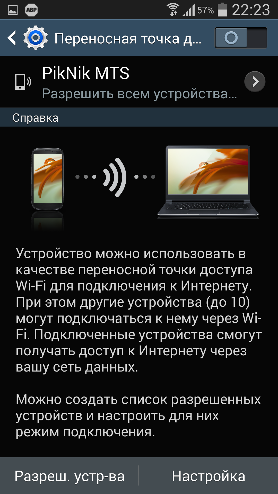 Некоторые смартфоны в зависимости от производителя также обладают дополнительными функциями, например, дают возможность запрещать подключение определённым устройствам или устанавливать другие ограничения. К плюсам работы в режиме точки доступа можно отнести высокую скорость соединения и возможность подключения к смартфону сразу нескольких устройств, а в число недостатков запишем быстрый расход заряда аккумулятора.