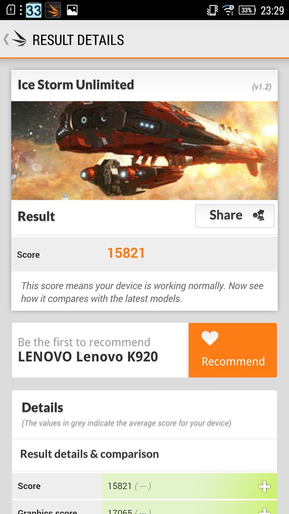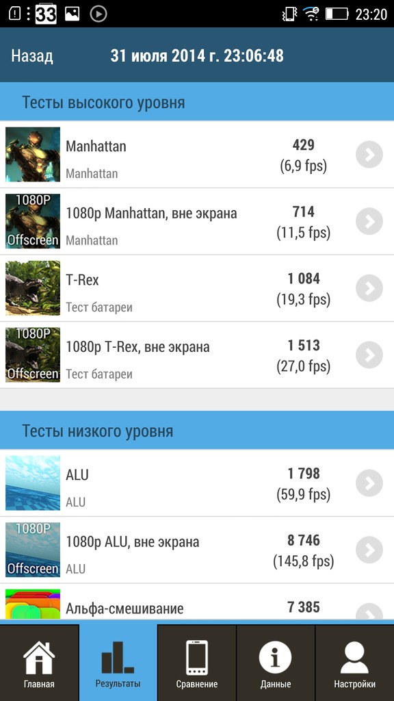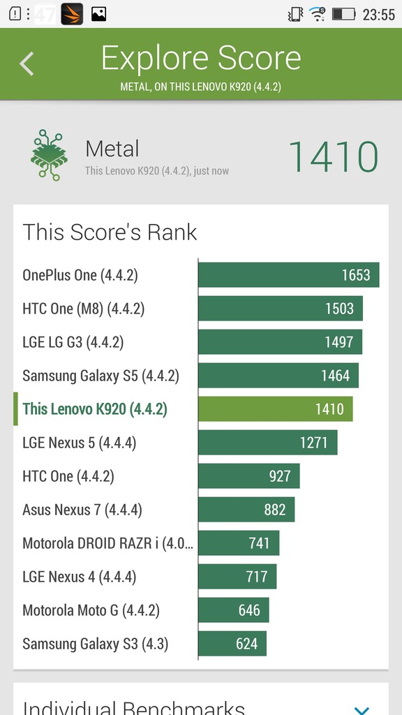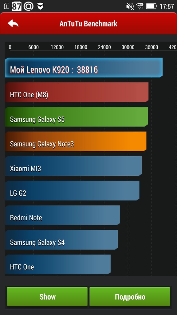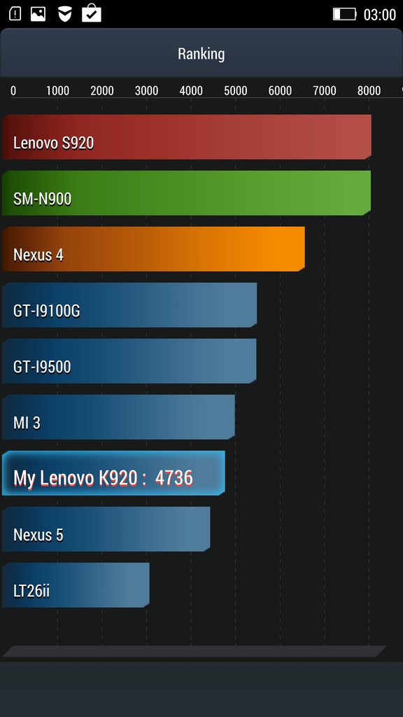 По бенчмаркам AnTuTu смартфон Lenovo — однозначный лидер, он оказывается даже мощнее, чем Samsung GALAXY S5 LTE-A (который с процессором Snapdragon 805), мощнее, чем LG G3. Другие бенчмарки не так однозначны (хотя стоит учитывать огромное разрешение экрана), но в любом случае аппарат в плане производительности выдающийся.