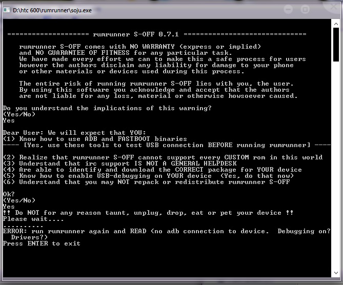 Вот что получилось-rumrunner S-OFF 0.7.1 ============================== rumrunner S-OFF поставляется без гарантии (явно выраженных или подразумеваемых) и никакой гарантии пригодности для конкретной задачи. Мы сделали все возможное, что в наших силах, чтобы сделать это безопасный процесс для пользователей, однако авторы не несут ответственности за ущерб, причиненный вашему телефону или других материалов или устройств, используемых во время этого процесса. Весь риск нарваться rumrunner S-OFF лежит на вас, пользователю. Используя это программное обеспечение вы признаете и соглашаетесь, что авторы не несут никакой ответственности за любые убытки, материала или иначе любой причине. Вы понимаете последствия этого предупреждения (да нет) Да Уважаемый пользователь Мы ожидаем, что ВЫ (1) Знать, как использовать АБР и быстрой загрузки бинарных файлов ---- [Да, использовать эти инструменты для проверки подключения USB перед запуском rumrunner] - --- (2) Поймите, что rumrunner S-OFF не может поддерживать каждый обычай ROM в этом мире (3) Поймите, что поддержка IRC нЕ ОБЩИЕ HELPDESK (4) в состоянии идентифицировать и скачать нужный пакет для вашего устройства (5) знать, как включить USB-отладки на устройстве (Да, сделать это сейчас) (6) Поймите, что вы не можете упаковать или распространять rumrunner S-OFF OK (YesNo) Да !! НЕ по любой причине насмешки, отключите, падение, есть или погладить устройство !! Пожалуйста, подождите .... .......... Проверка обновлений ...... ОШИБКА выглядит устройство не коренится И не хватает незащищенных ядро. су или FU !! ! Нажмите кнопку ENTER, чтобы выйти из