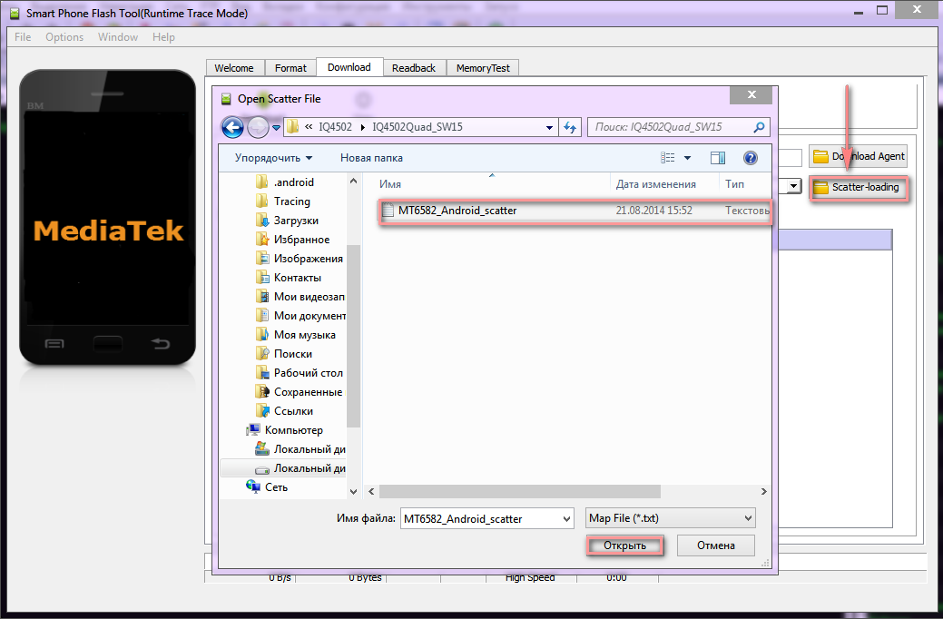 3. Запустить SP Flash Tool, нажать на кнопку scatter-loading, в открывшемся проводнике выбрать файл MT6582_Android_scatter.txt, который лежит в папке с прошивкой.