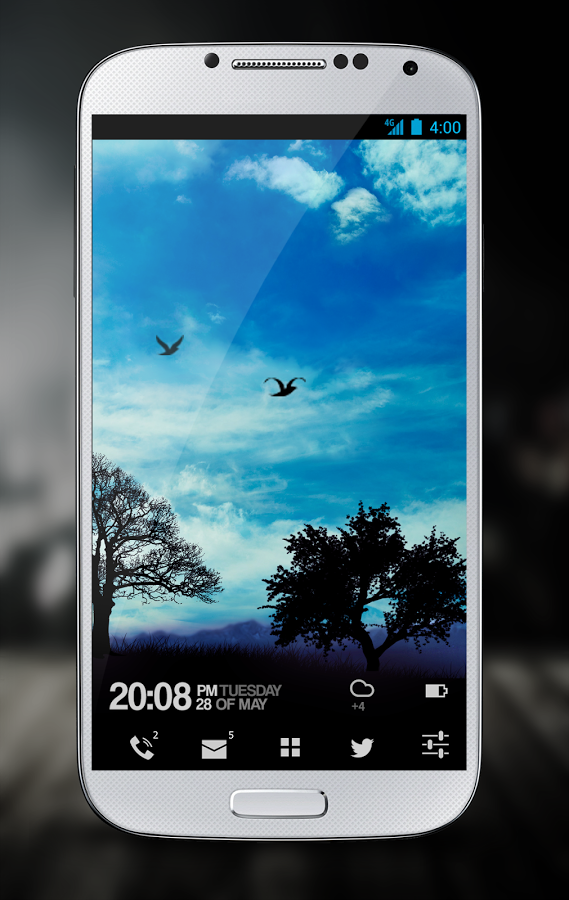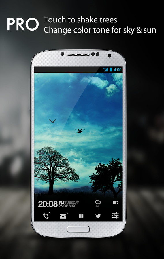 Живые обои с дневной сценой: пара деревьев, пролетающие птицы, плывущие по небу облака, ветер играющий в ветвях деревьев. Все просто и ненавязчиво. Обои с параллакс эффектом, реагируют на прикосновение, можно включить звук птиц, а так же многое другое.
