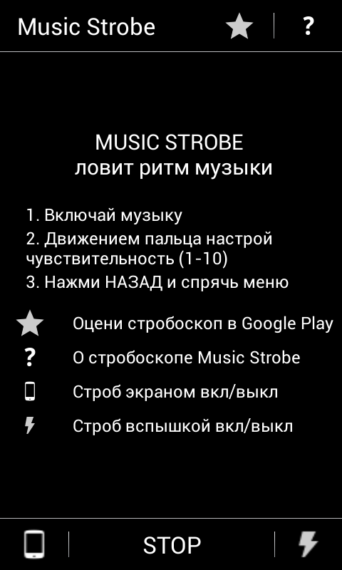 приложение от разработчика A-App (icorus), реализующее настоящий стробоскоп, который будет во время звучания музыки ловить ее ритм и мигать вспышкой и/или цветным экраном. В настройках так же можно установить необходимую чувствительность.