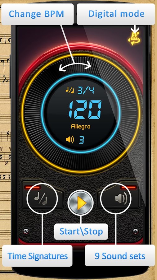 Приложение метроном от разработчика Real Guitar. Real Metronome весьма простой в использовании и представлен в двух видах: цифровой и классический, имеет порядка десяти наборов звуков.