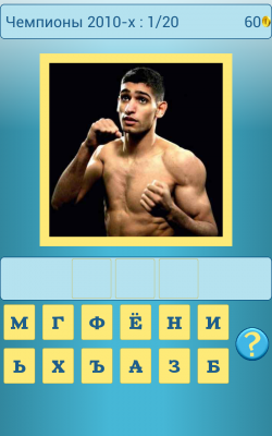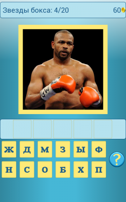 Правила игры просты: угадай фамилию боксера по фотографии. Можно пользоваться подсказками (жми на знак вопроса справа от букв).