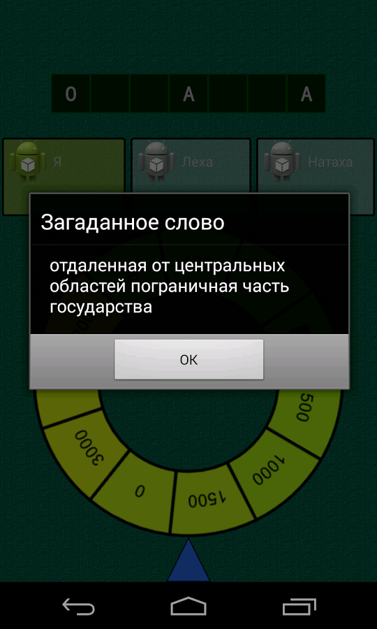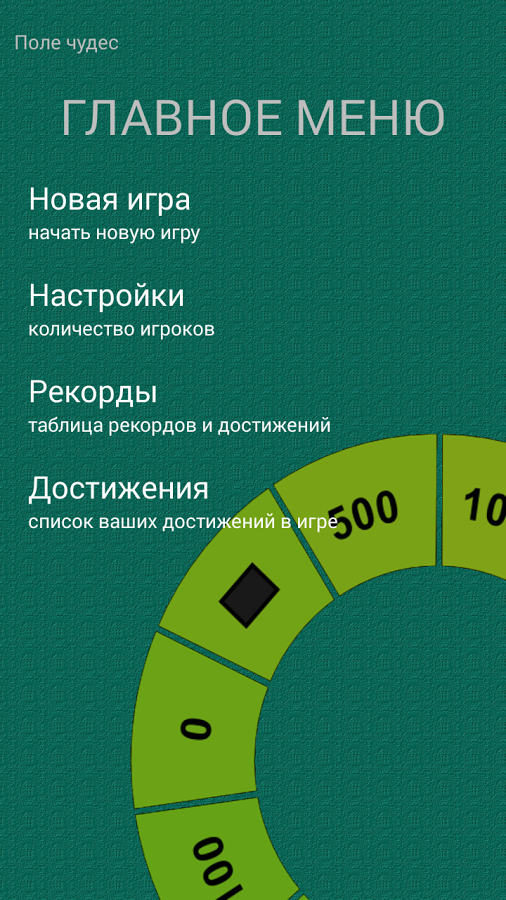 Мобильная игра по мотивам ТВ шоу "Поле чудес". В игре необходимо отгадывать слова называя буквы. Букву можно назвать только после вращения барана, деленного на сектора. В секторах указаны числа и бонусы. Число указывает количество очков за правильный ответ. Бонусы бывают нескольких видов: