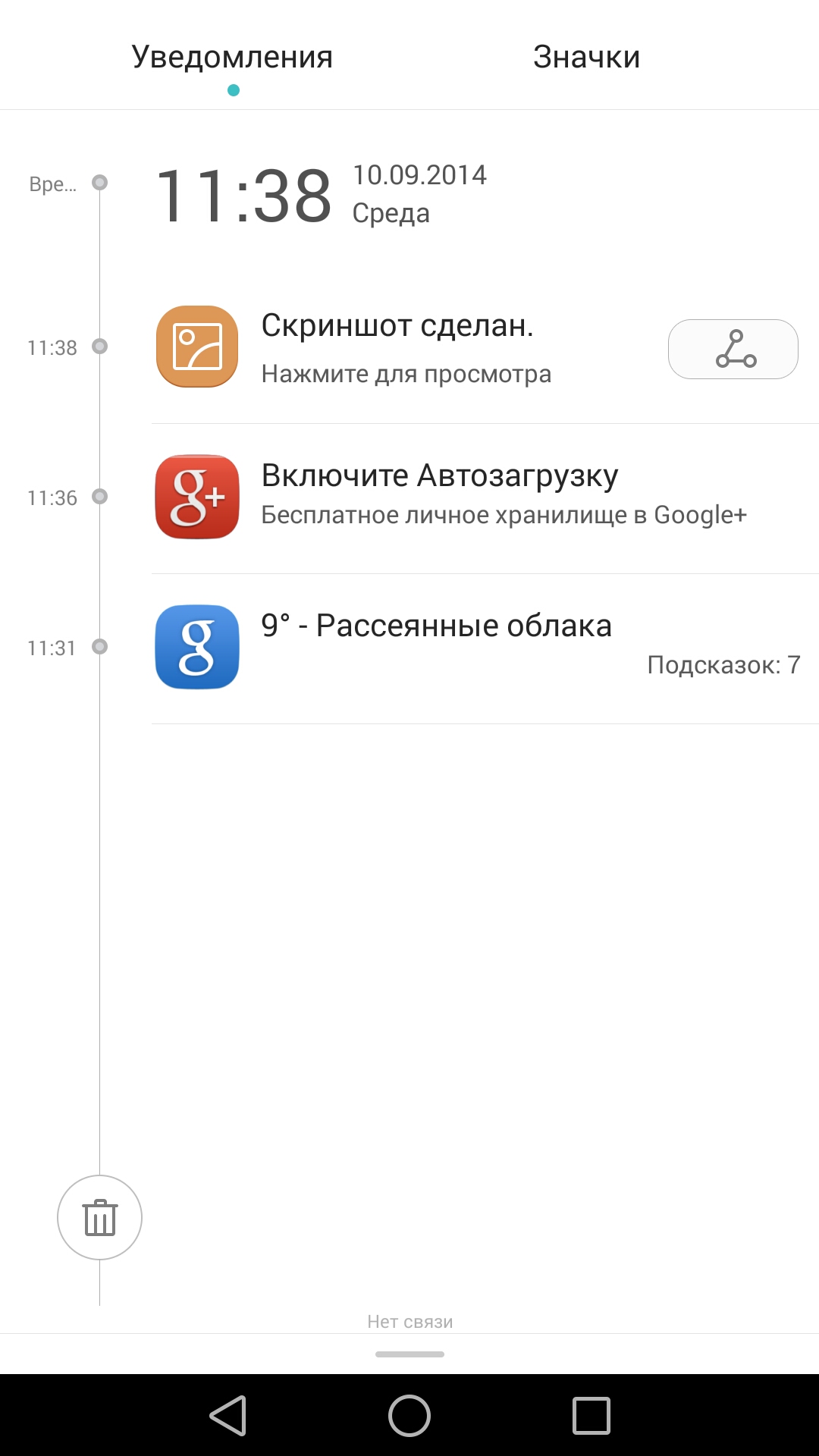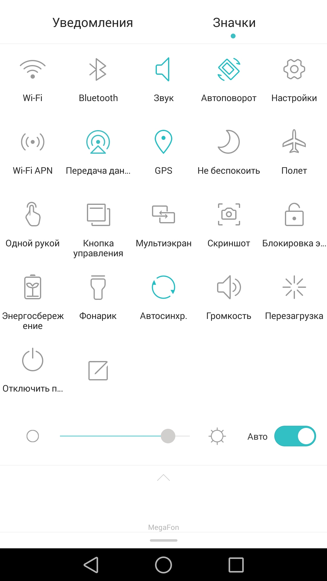 Опускающихся сверху шторок в интерфейсе две — если потянуть за верхнюю левую часть дисплея, появится окно с уведомлениями, а если за правую — окно с иконками настроек.