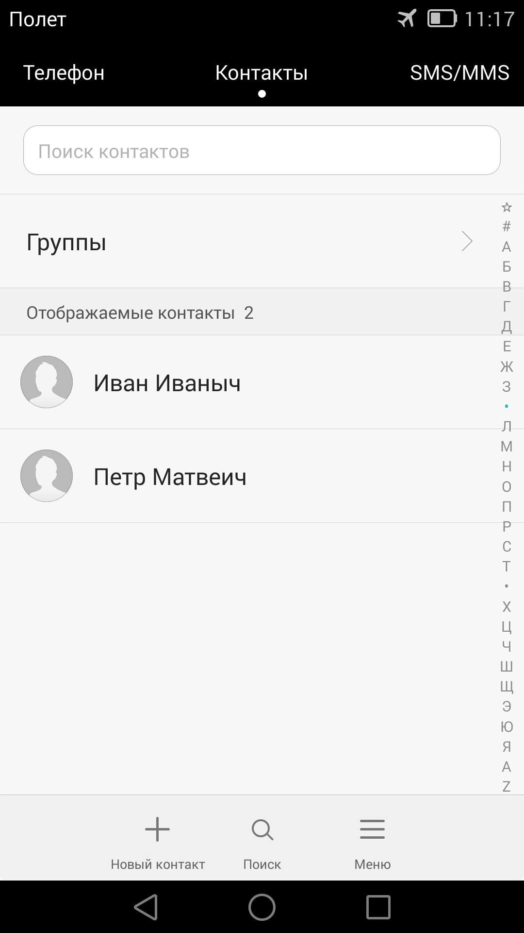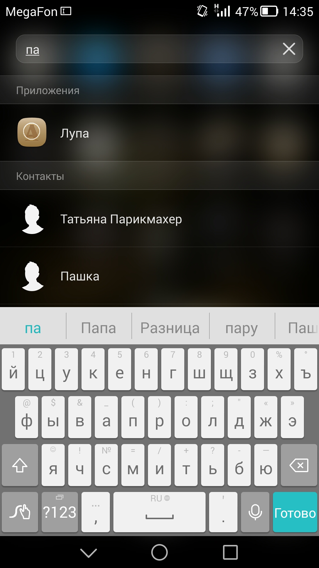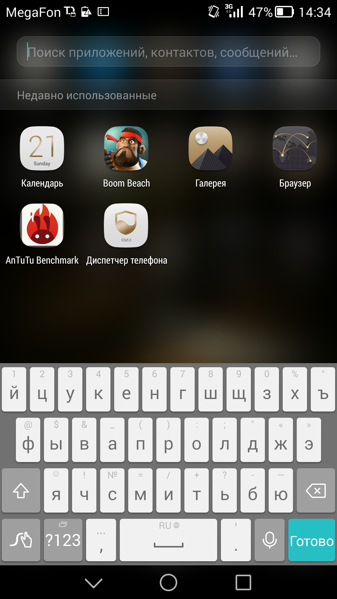 В любом месте главного экрана можно сделать свайп вниз, и появится меню поиска по смартфону. Пока не введено никаких символов, смартфон покажет недавно использованные приложения, а как только вы начнете вводить какие-либо символы, появятся и первые результаты. Искать можно не только по первым знакам. Поиск производится всюду: по контактам, программам и просто файлам, как в памяти устройства, так и на подключенных накопителях.