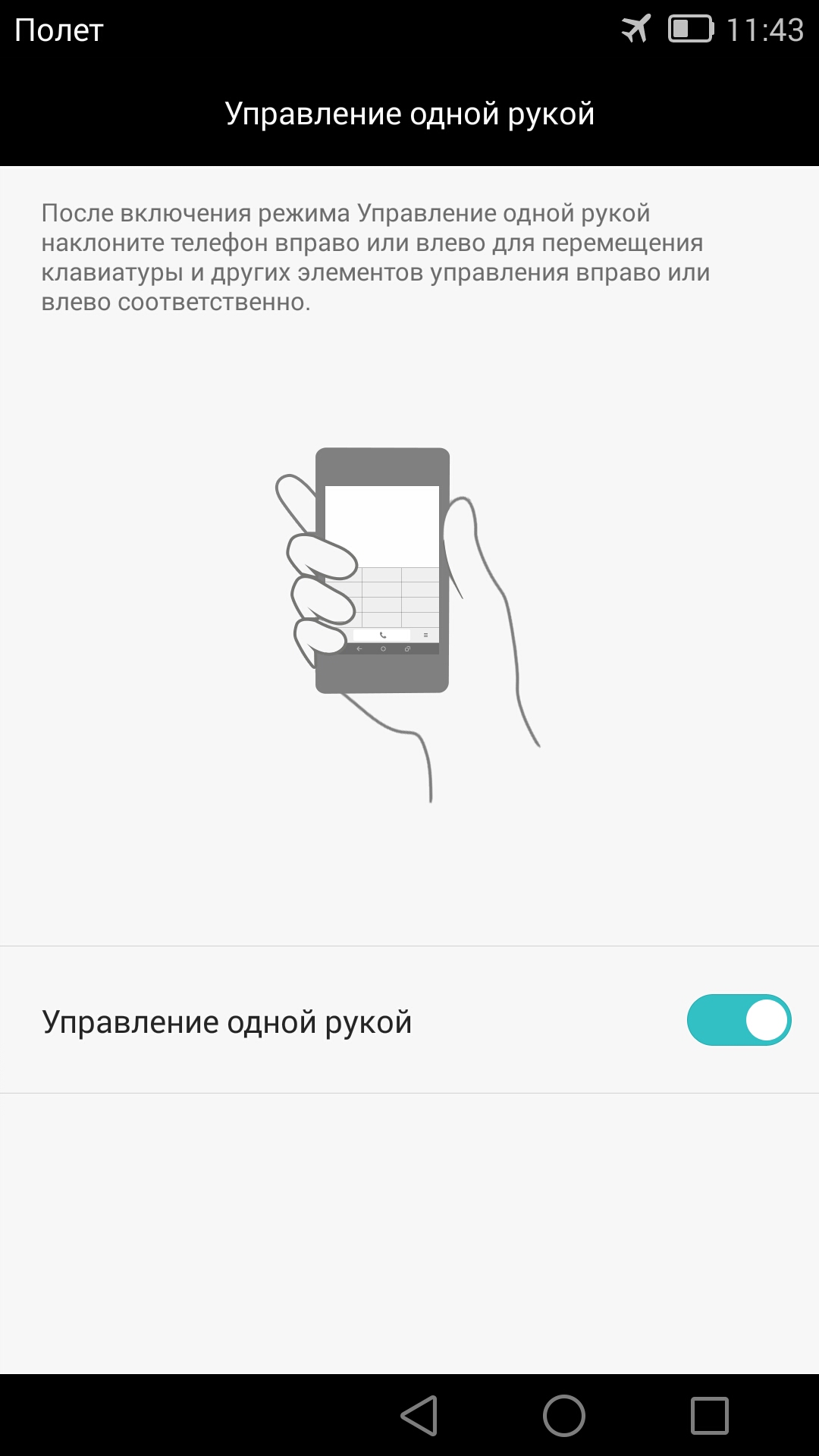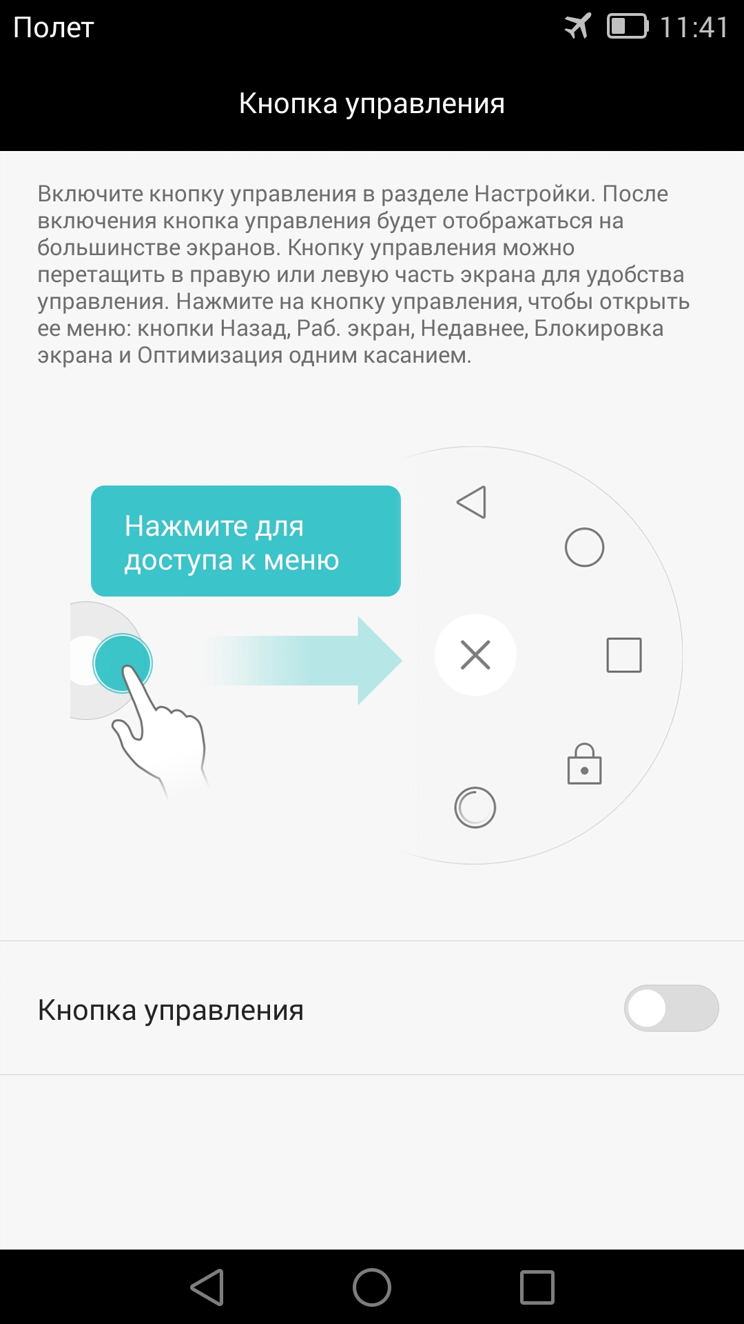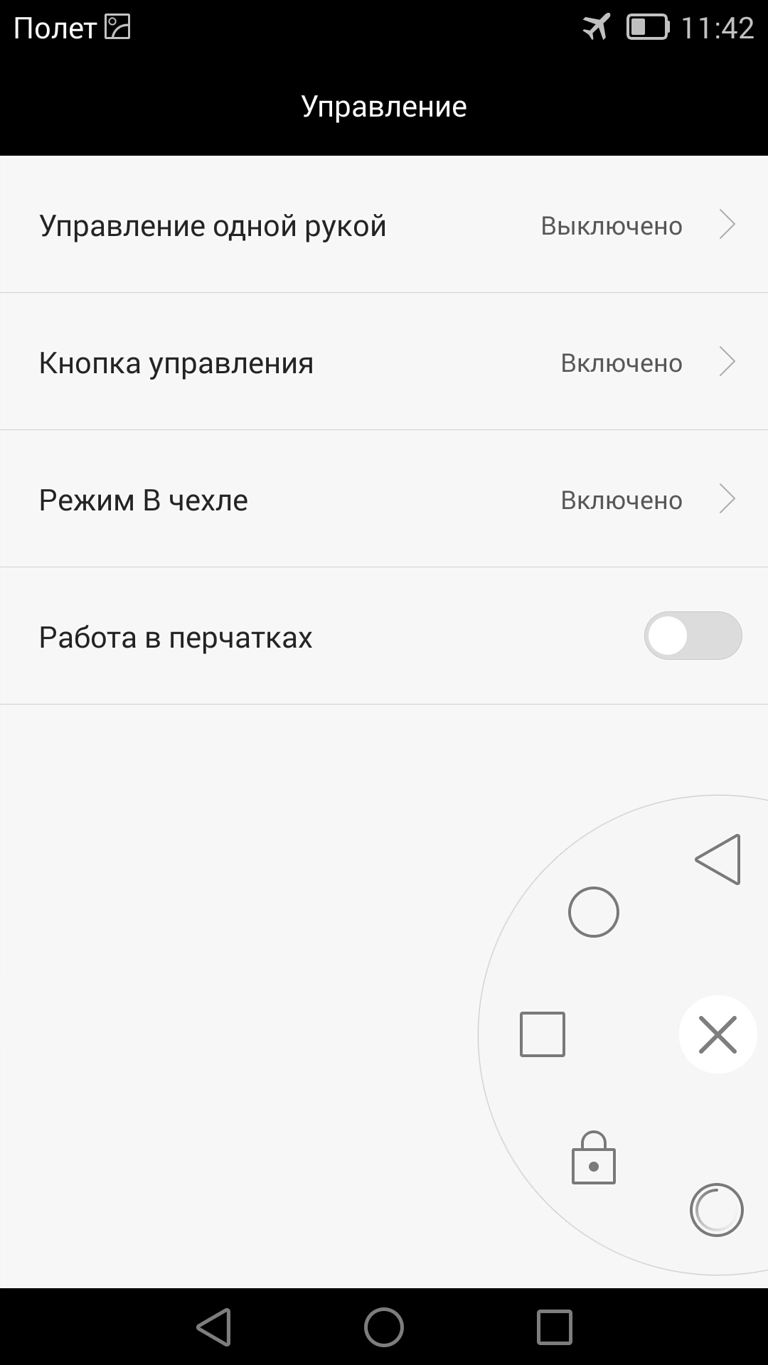 Есть режим управления одной рукой и режим повышенной чувствительности дисплея, чтобы смартфоном можно было пользоваться, не снимая перчаток. А еще есть «кнопка управления» — специальная графическая кнопка, которую можно разместить с любого края дисплея в таком месте, где ее будет удобно нажимать большим пальцем. При нажатии на эту кнопку появится специальное меню с экранными клавишами навигации.
