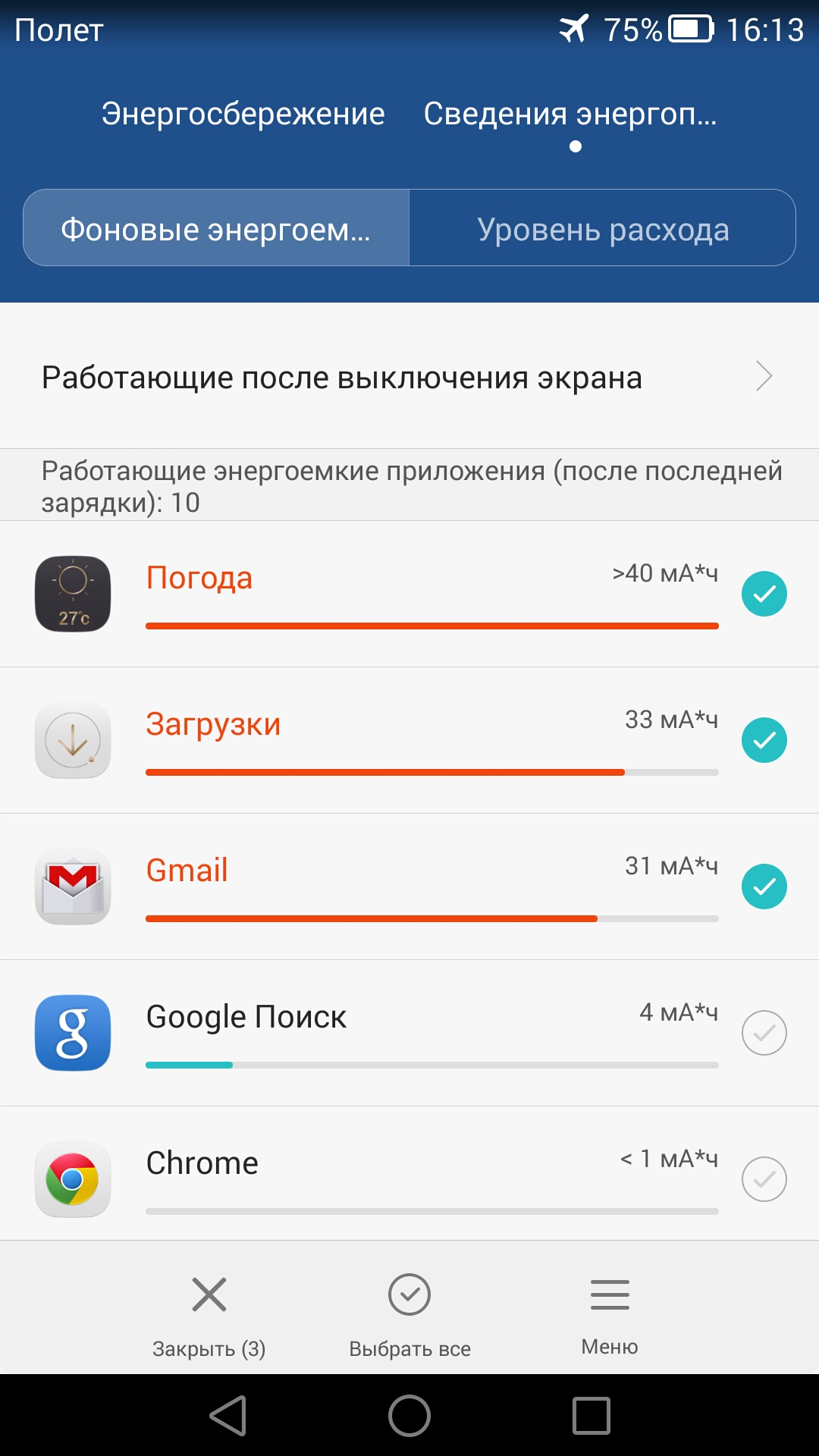 Здесь же можно выяснить, какая программа продолжает работать при выключенном дисплее и, если это, например, ненужный калькулятор, запретить ему работать при переходе в спящий режим.