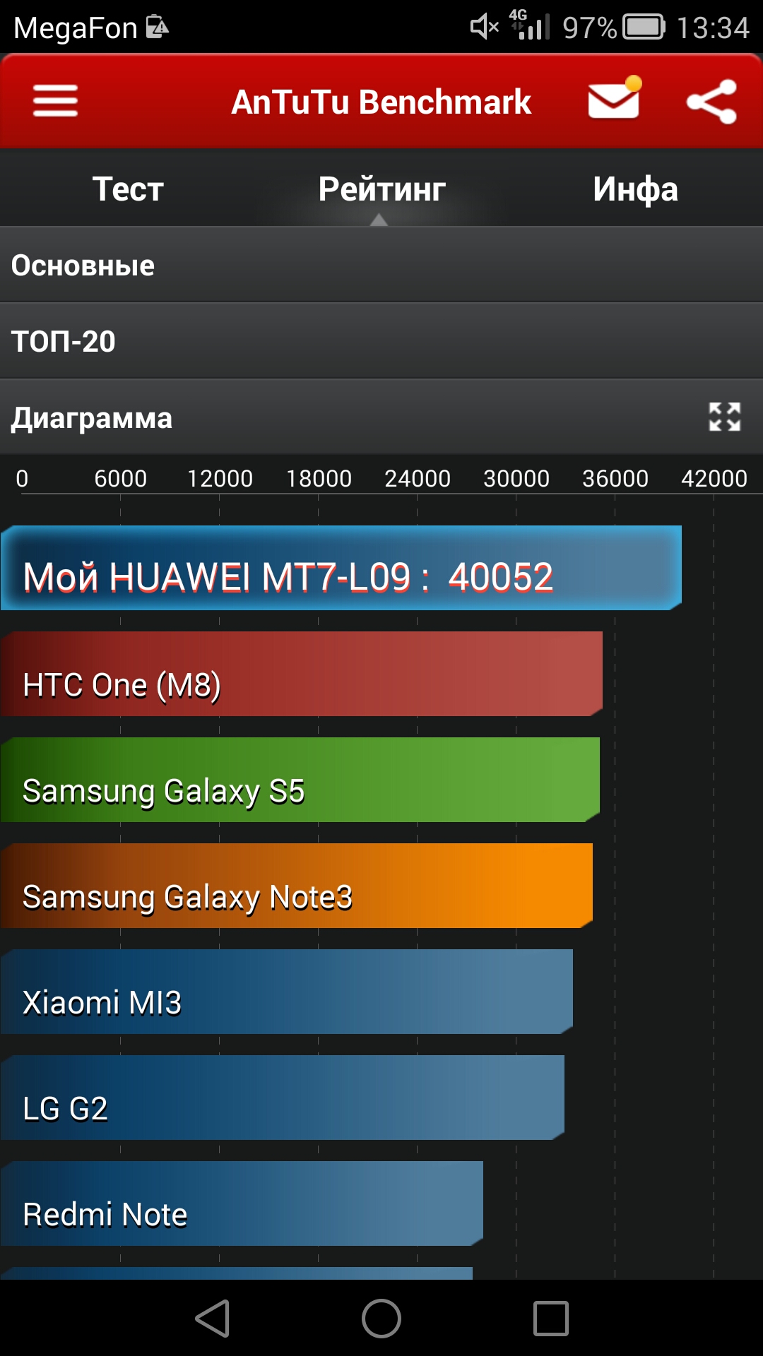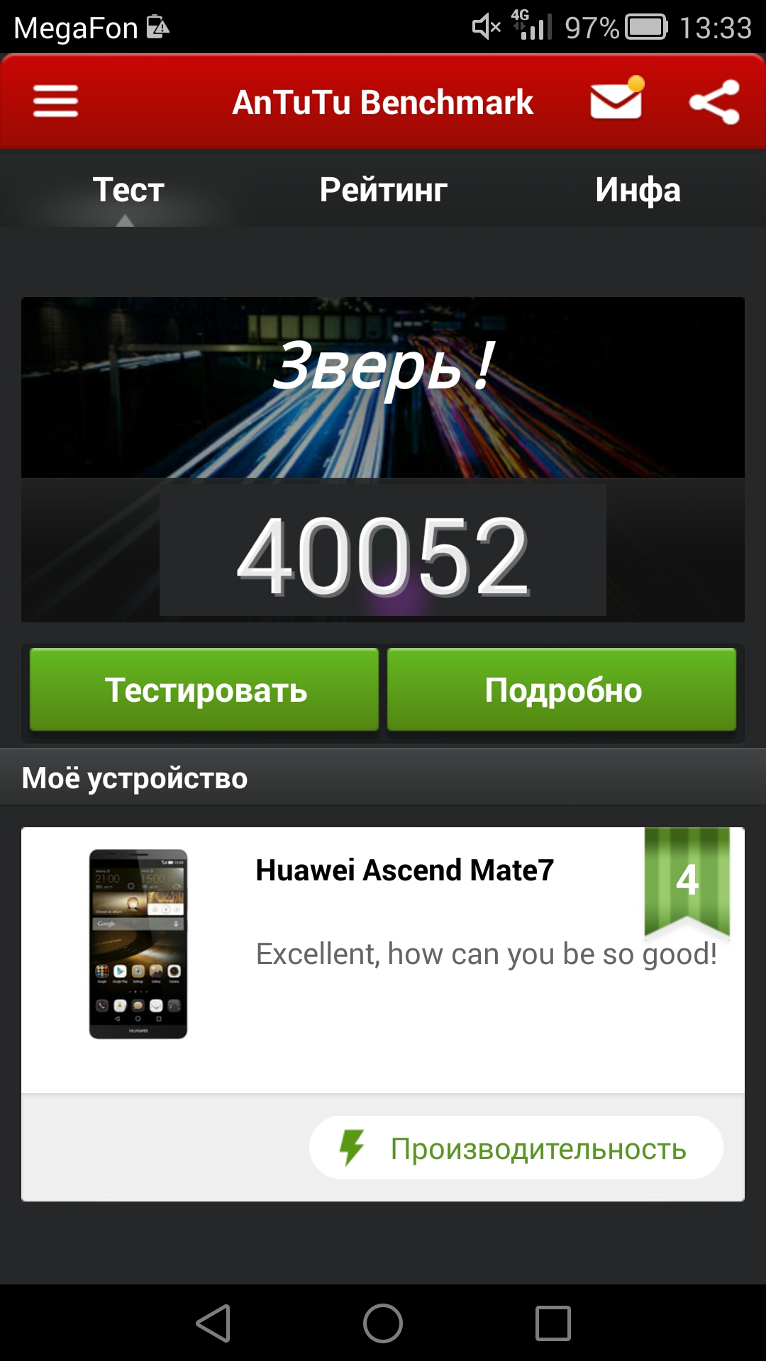 Автономности у Huawei Ascend Mate7 — завались. Если им активно пользоваться как телефоном, довольно часто проверять почту и серфить, то к концу дня остается около 50% заряда. В нашем случае, после довольно серьезных нагрузок смартфон смог разрядиться на 35% почти за 15 часов.