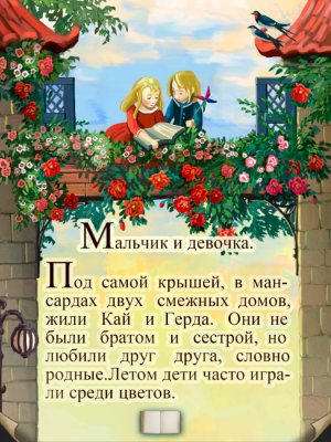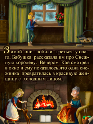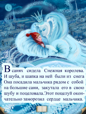 Осколок дьявольского зеркала, угодивший в глаз Кая, заморозил его юное сердце. Чтобы спасти мальчика от чар Снежной Королевы, вашему чаду придется бок о бок с Гердой пройти немало препятствий, проявить храбрость, смекалку и милосердие. Малыш познакомится с Маленькой Разбойницей, Доброй Принцессой, Северным Оленем; соберет воедино осколки злопооучного зеркала, чтобы навсегда покончить со злом. Люди,зверушки, птички, даже облака и цветы моментально оживут и откликнутся на каждое прикосновение ребенка. Поленья в камине станут уютно потрескивать, киска замяукает, заржут резвые кони, даже запотевшее от мороза стекло прояснится, когда легонько потрешь его пальчиком. Все взаправду, все как в жизни...