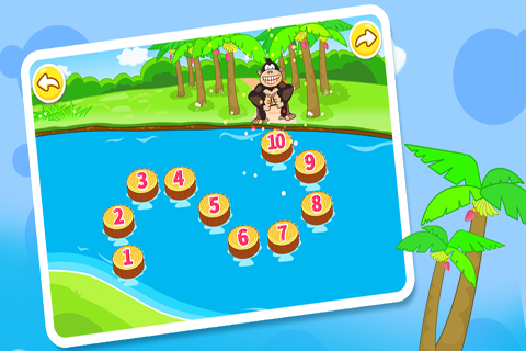 В большом красивом лесу живут добряк-горилла и наш любимый панда Кики. Однажды им понадобилось перебраться на другой берег реки, и тут возникла проблема: бревнышек, по которым можно перейти, не хватает! Помочь животным можешь только ты! Но для этого тебе нужно обязательно знать цифры. Помощь твоя им понадобится также для того, чтобы поесть их любимую еду.