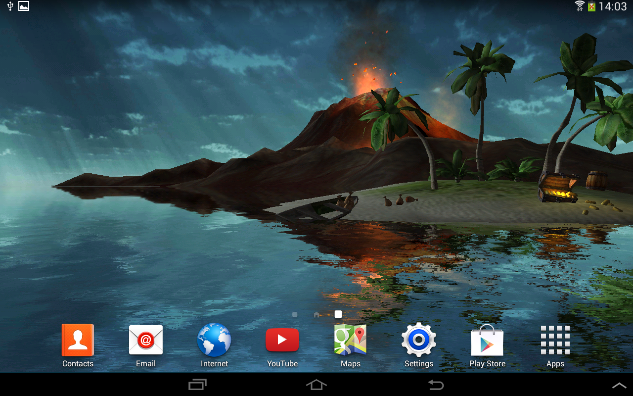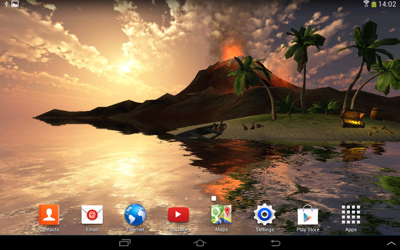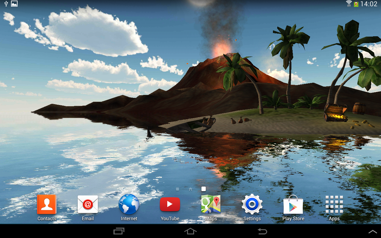 После установки обоев на телефон, мы имеем 3D картину происходящего: вид с моря и небольшого острова на действующий вулкан, извергающий тонны лавы и пепла из своего конуса. Действие происходит постоянно, силу лавы можно регулировать и так же регулируется вид картины в целом, благодаря настройкам неба - их два десятка от чистого синего, до заката и ночного с огромной неземной Луной! На переднем плане какое те кораблекрушение, сидят моряки, а вокруг, в предвкушении халявного обеда плавают акулы! Часть обломков о вещи разбросаны по острову - кто то выбрался, но вулкан вряд ли оставит им шансы остаться в живых...