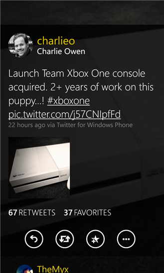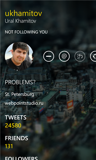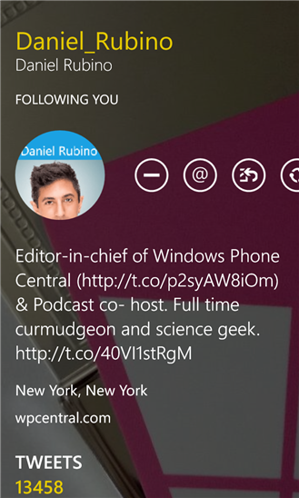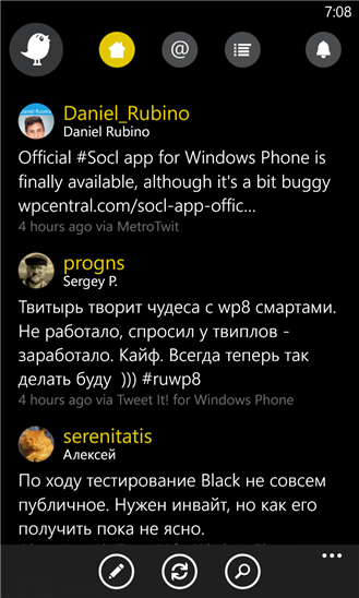 Приложение является одним из клиентов Twitter для windows phone. Объединение красивой анимации, понятный интерфейс и большое количество функций дадут вам ощущение что вы общаетесь через Twitter. Приложение поддерживает все основные функции такие как: просмотр твитов, фотографий и видео с YouTube. Теперь вы всегда будете в курсе новостей и современных тенденций.