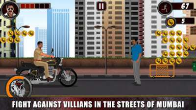 Singham returns: The game - бесстрашный индийский полицейский несется по улицам Мумбаи, перепрыгивая через различные препятствия, собирая бонусы и сражаясь с врагами на пути. Помогите герою очистить улицы Мумбаи от преступников в этой игре для Андроид. Бегите вперед и бросайте в бандитов разнообразные предметы. Используйте специальные атаки с помощью полицейского ремня. Садитесь на мотоцикл и двигайтесь еще быстрее. Станьте воплощением правосудия, сражайтесь с бандитами, пытающимися остановить Вас. Доберитесь до преступных боссов, победите их и восстановите порядок в городе.
