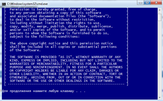 7. Вашему вниманию будет предоставлено окно командной строки с лицензионным соглашением