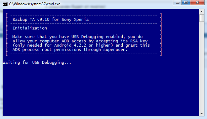 8. Подключите ваш Xperia Z1 Compact к компьютеру и при появлении в командном окне "Waiting for USB Debugging", подтвердите на телефоне разрешение на отладку USB (если раньше, конечно же, этого не сделали)
