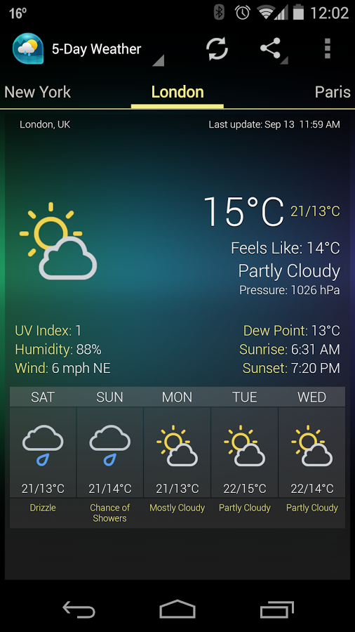 Еще один прогноз погоды для андроид устройств от разработчиков Devexpert.NET. Скачайте бесплатно, установите на свой смартфон или планшет и получите точный прогноз погоды на четыре дня по всему миру. Приложение находит нужный вам город довольно быстро предоставляя информацию о влажности, температуре, ветре и пр. Android Weather может обновляться как автоматически (с интервалом, 1 час, 3 часа, 12 часов), так и вручную.