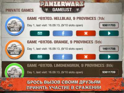 PanzerWars является мультиплатформенной игрой, которая доступна как на iPhone, iPod и iPad, так и на Android устройствах. Возьми под свое командование целые танковые дивизии и играй дома или в пути: при помощи быстрой смены в твоей тактике ты сможешь перехитрить твоих врагов. Создай игру со случайными оппонентами или играй со своими друзьями. Если ты соединишь свой аккаунт с Facebook, то ты сможешь делиться своими достижениями с твоими друзьями и с легкостью приглашать их в свои игры. Твои сражения приведут тебя к верхушке глобального рейтинга. Докажи всем, что ты истинный танковый генерал.