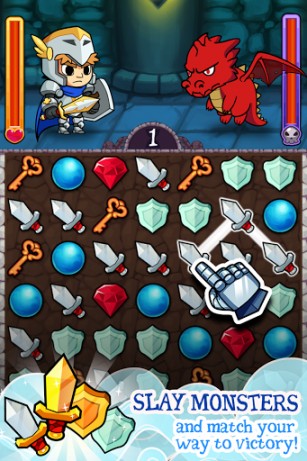 Проведите пальцем и соедините 3 одинаковых меча или больше, чтобы бороться с монстрами. Соедините 3 щита или больше, чтобы защитить вашего героя. Делайте то же самое с драгоценными камнями – это тоже сработает! При помощи драгоценных камней вы можете делать апгрейд вашего героя, чтобы он мог сражаться с более сильными монстрами. Пользуйтесь ими с умом!