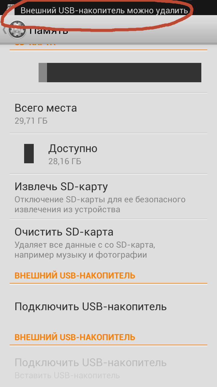 8. После отключения, в строке Уведомлений появится сообщение "Внешний USB-накопитель можно удалить" + если опустить шторку, так же будет сообщение "Удалено Внешний USB-накопитель"