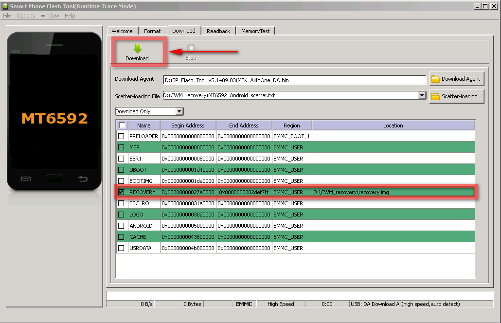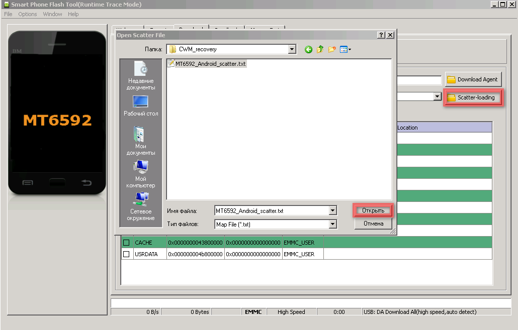 5. В окне программы нажать на кнопку scatter-loading, в открывшемся проводнике выбрать файл MT6592_Android_scatter.txt, который лежит в папке CWM_recovery.
