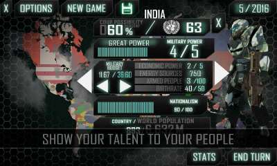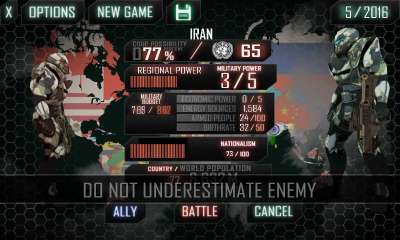 World War 3 - в этой игре вы будете проходить сценарий Третьей мировой войны. Вы сможете выбрать страну и привести её к победе, одновременно строя политические связи, покупая вооружение и устанавливая военный бюджет. Также вы будете регулировать количество населения.