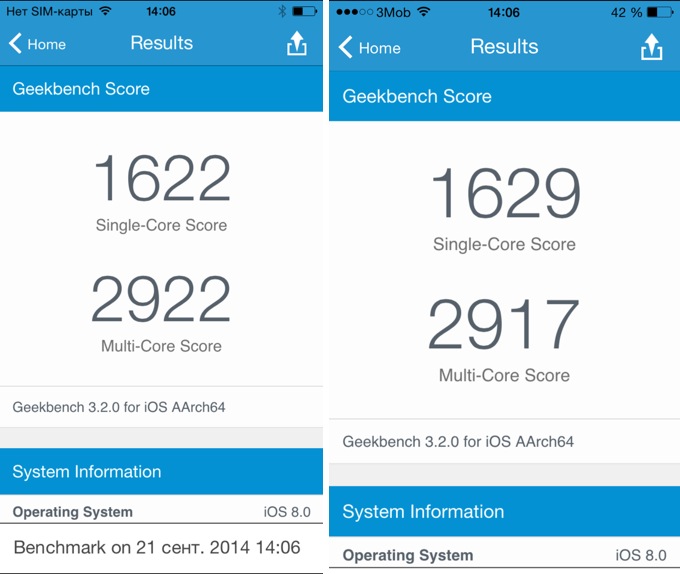 Говорить о технических характеристиках в мире мобильных устройств компании Apple не принято. Где вы слышали, чтобы пользователи разных поколений айфонов говорили о процессорах, оперативной памяти и, простите, разгоне? Но вы же хотите этого, правда? Тогда вот вам сравнение двух смартфонов в iOS-приложении Geekbench для подсчета быстродействия процессора: