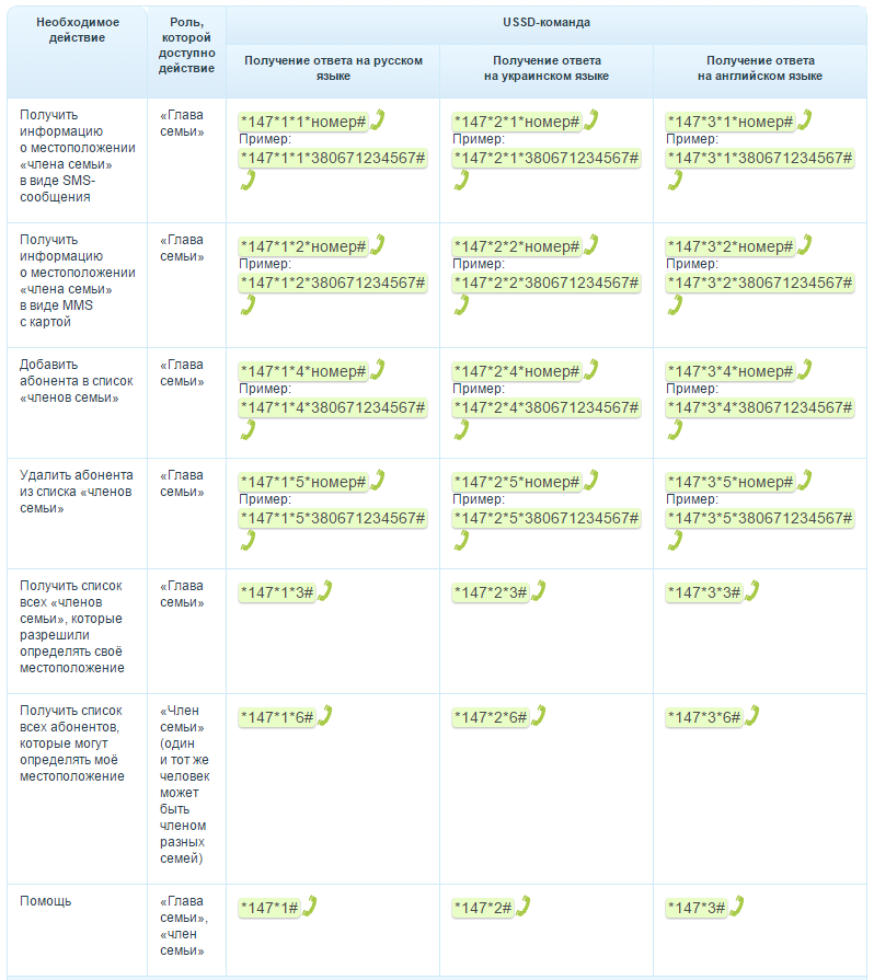 - Чтобы воспользоваться услугой «Маячок» посредством USSD-команд абоненту необходимо набрать на клавиатуре мобильного телефона соответствующую команду (см. таблица ниже) и нажать кнопку вызова.