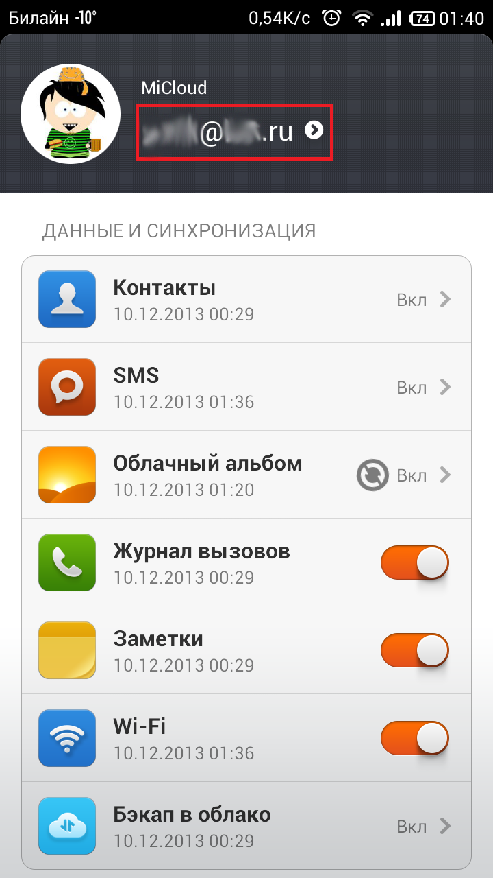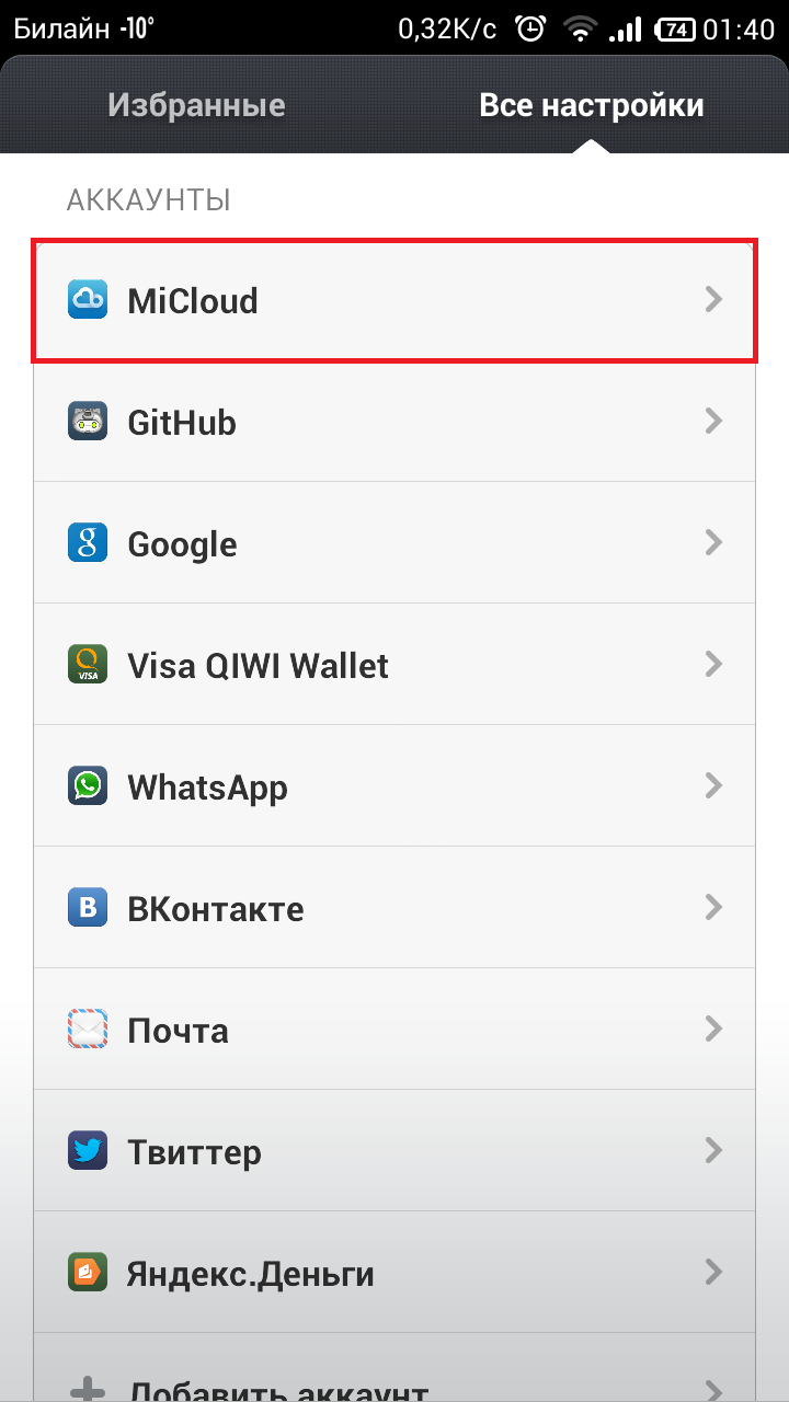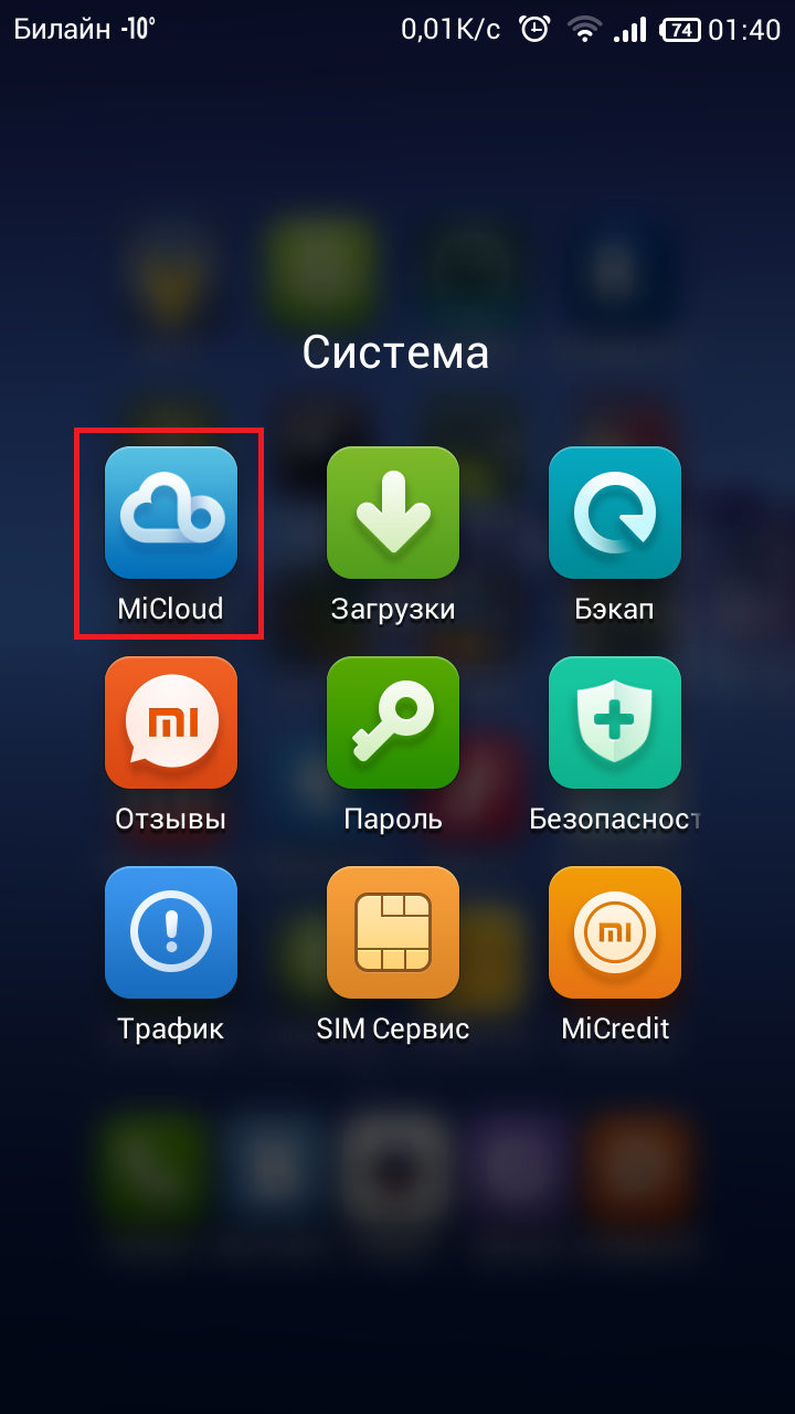 - Найдите ярлык MiCloud в папке Система или в настройках > Аккаунты