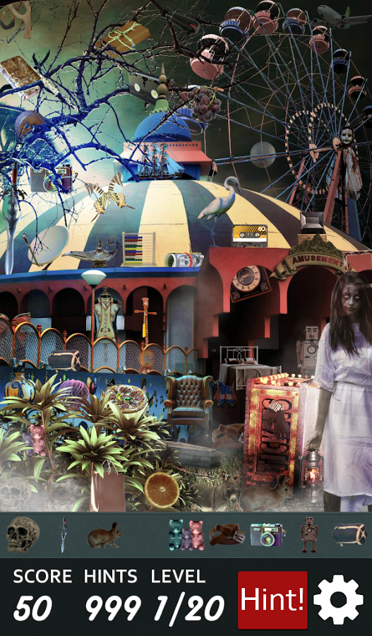 Игра по поиску предметов с жуткими сценами карнавала. В ваш город приехал карнавал, но вместо веселья он у вас вызывает только ужас и страх. В этих 20 сценах вам предстоит искать скрытые предметы, которые изменяются каждый раз, когда вы начинаете игру заново. В этой игре вас ждут 4 способа поиска предметов: найти предметы на картинках, искать предметы по силуэтам, по списку слов и случайный выбор вышеуказанных способов. Также выбирайте понравившийся режим игры, используйте подсказки и следите за мутантами и монстрами которые будут вас окружать.