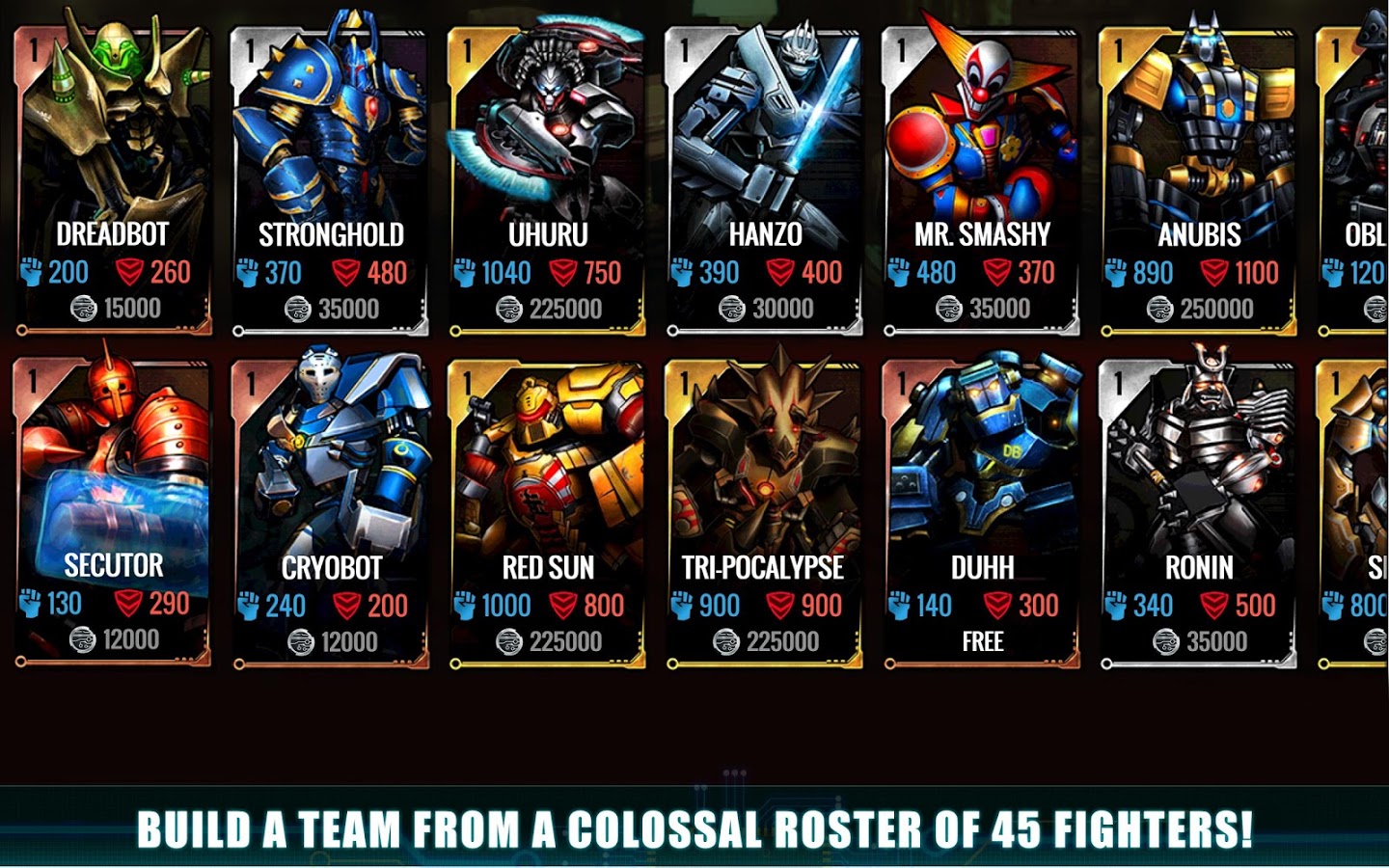 Масштабные и зрелищные бои роботов, которые не знают боли, жалости и границ дозволенного. Создайте свою непобедимую команду воинов. Геймплей представляет собой разные комбинации сенсорных жестов, которые создают сокрушительные удары - хук, апперкот, прямой удар и др. Визуализация и графика на высоте, что дает игре дополнительное преимущество среди прочих.