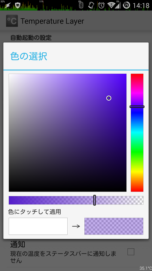 Простое приложение отображающее температуру аккумулятора вашего устройства поверх всех приложений в текстовом виде. Из настроек доступны: выбор размера, цвета, шрифта, расположение в любом месте экрана, убрать значок из верхней панели уведомлений.