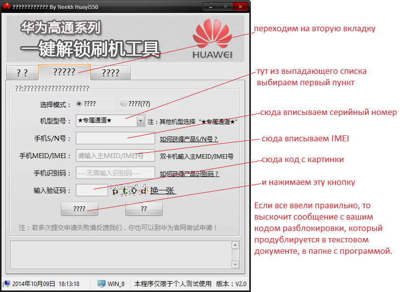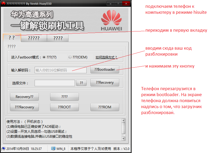 1. Из вложений к данному сообщению (внизу) скачиваем утилиту HW-QmOneKeyTool которая поможет нам получить код разблокировки загрузчика и делаем как показано на изображениях ниже: